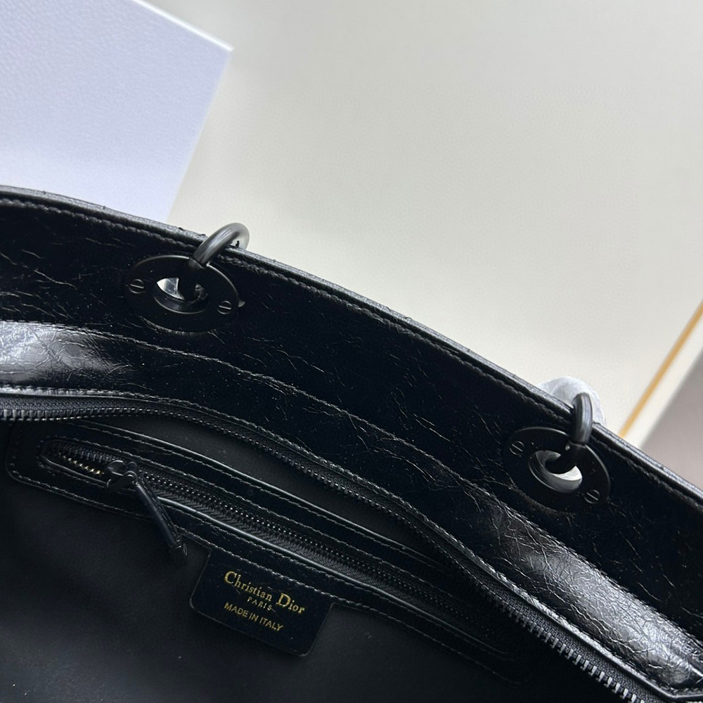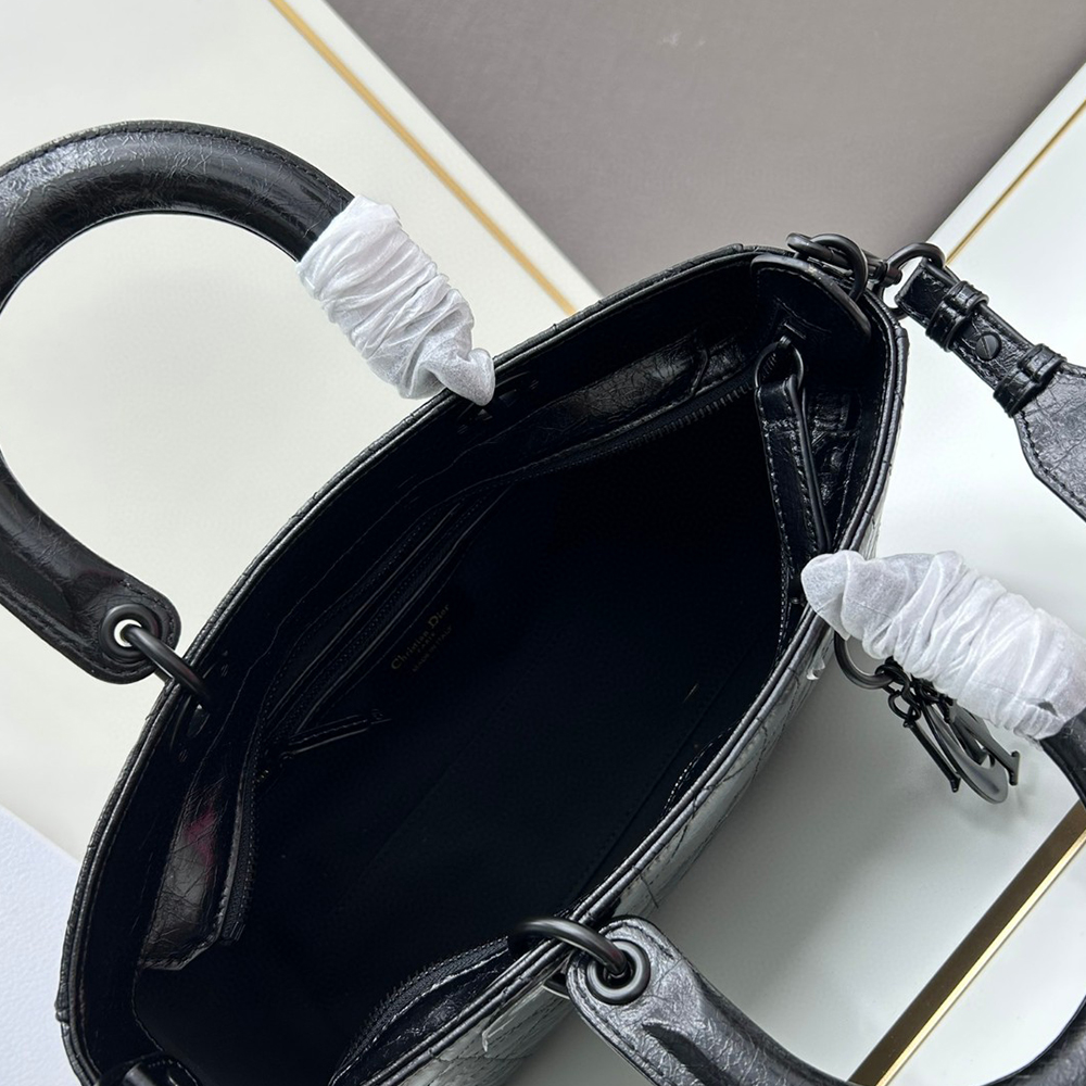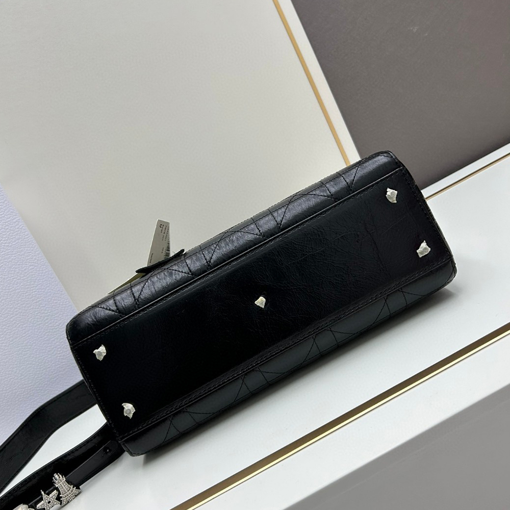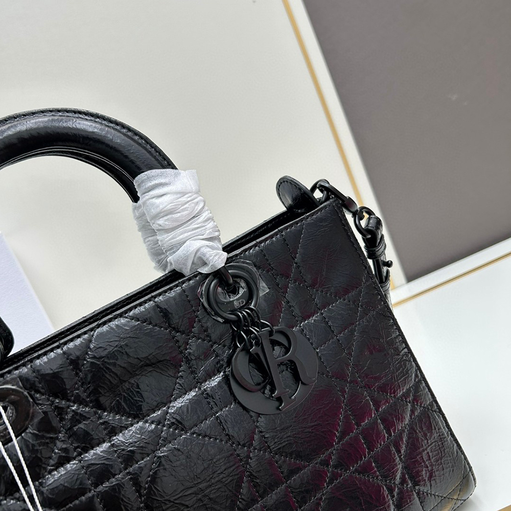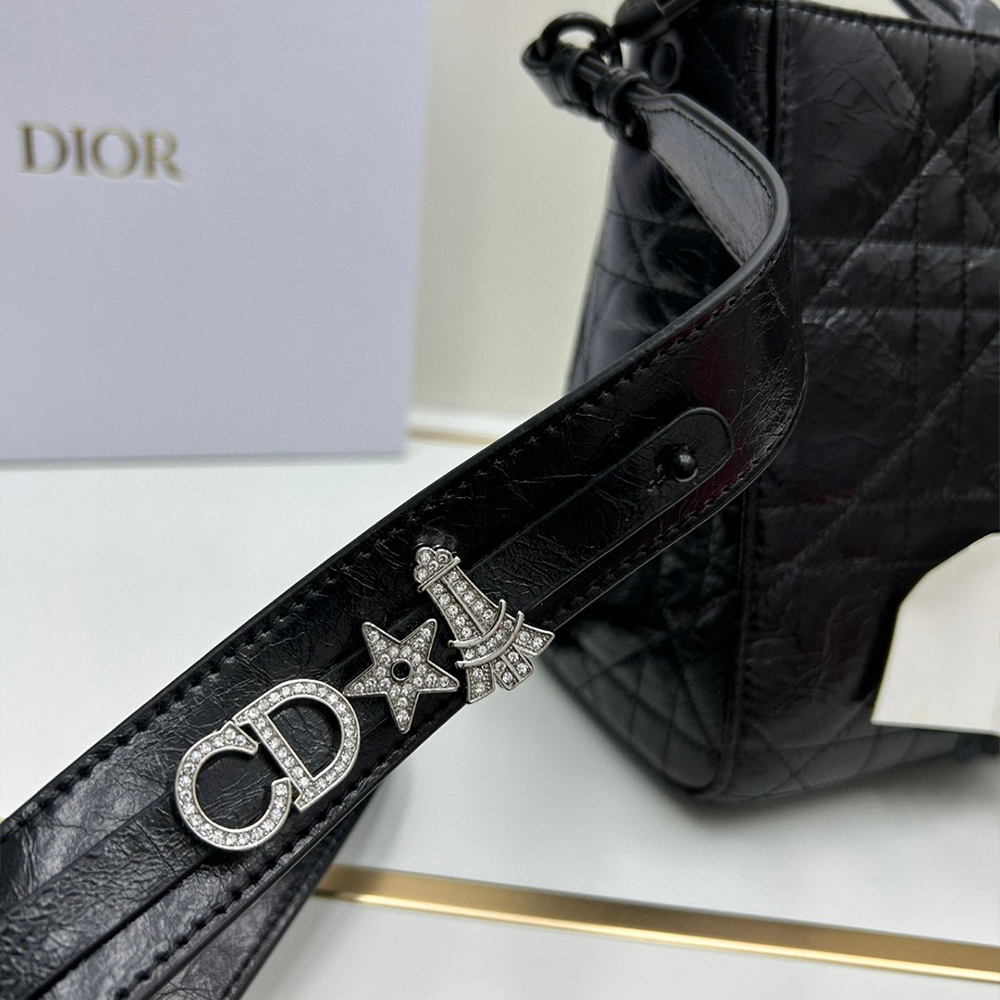 New for the season and appearing in the Spring-Summer 2024 Fashion Show, the Lady D-Sire My ABCDior bag draws inspiration from the iconic elegance of the Lady Dior design. Reimagined with a casual style for an urban look, the black crinkled calfskin is accented by Macrocannage topstitching, while tonal ultra-matte metal D.I.O.R. charms lend a modern touch. Showcasing a shoulder strap that can be personalized by adding symbolic badges, the unique medium bag can be carried by hand or worn crossbody.See more