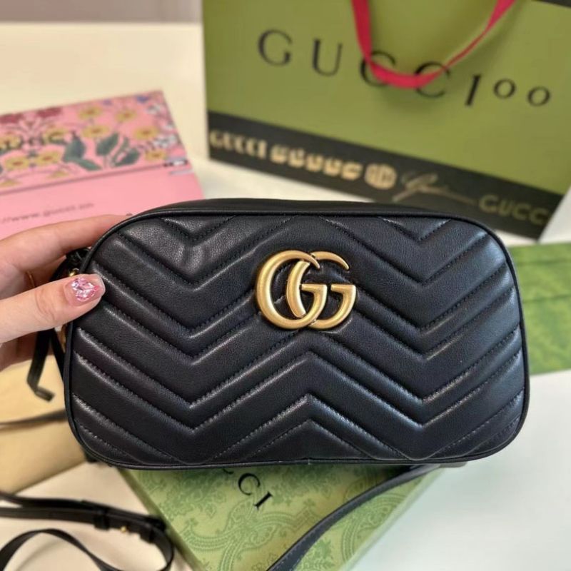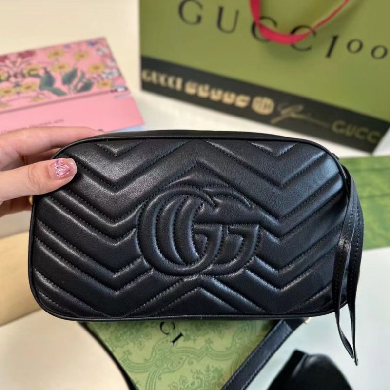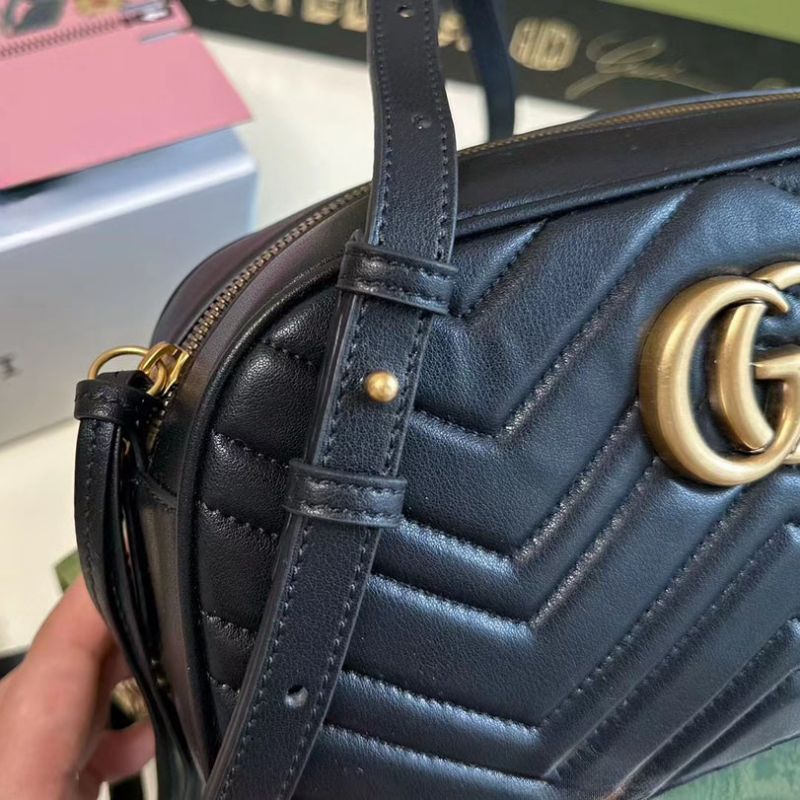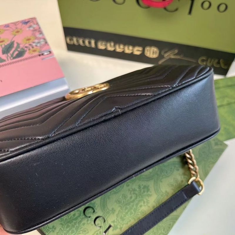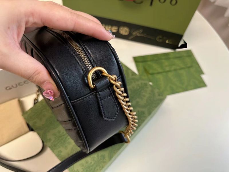 The GG Marmont small camera bag has a softly structured shape and a zip top closure with the Double G hardware. The chain shoulder strap has a leather shoulder detail. Made in matelassé leather with a chevron design and GG on the back.