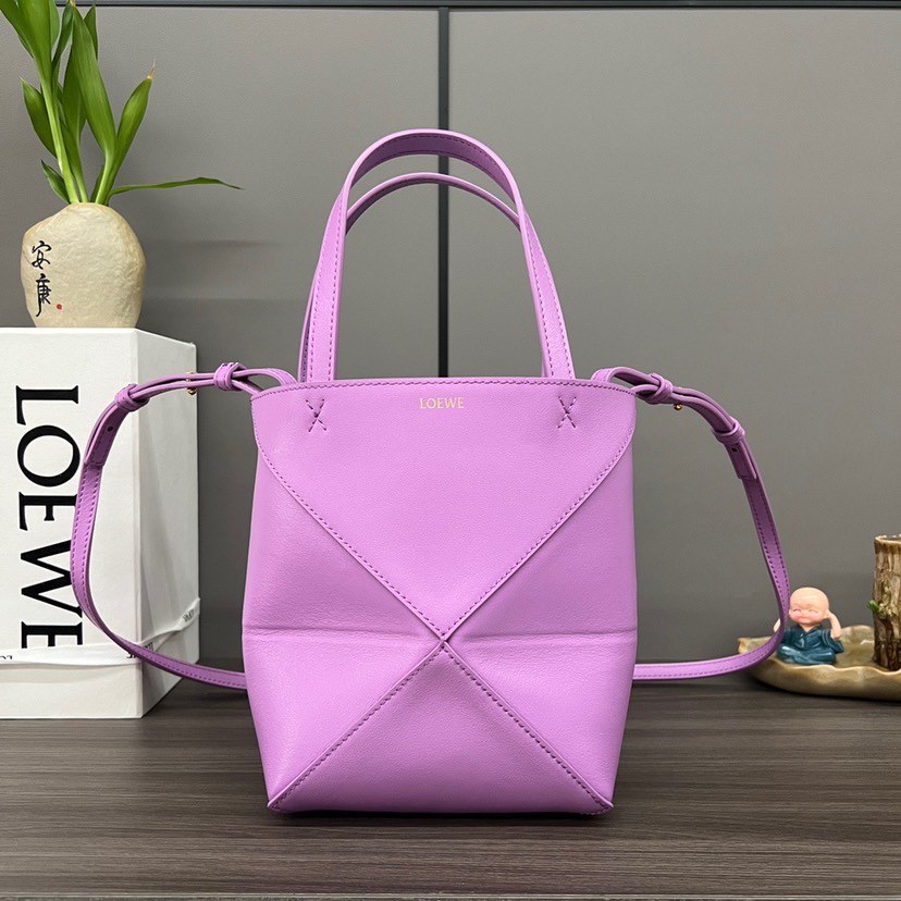 DetailThe Puzzle Fold Tote takes the iconic bag’s signature geometric lines and reimagines them in graphic and architectural panels that allow the bag to fold completely flat, making it the perfect travel companion. Soft, lightweight and inventively crafted, it is finished with discreet LOEWE branding. This mini version is crafted in shiny calfskin.Shoulder, crossbody or hand carryDetachable and adjustable strapSuede liningGold embossed LOEWEMeasures: