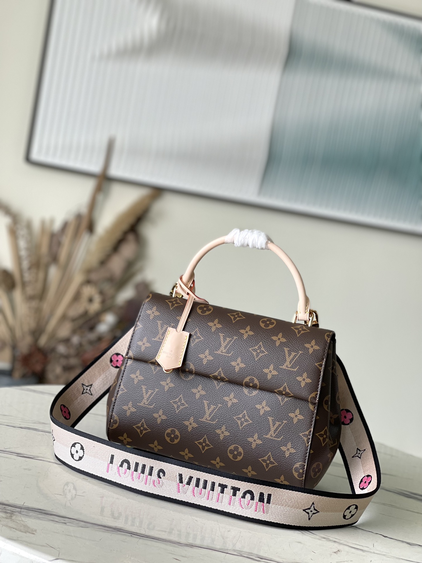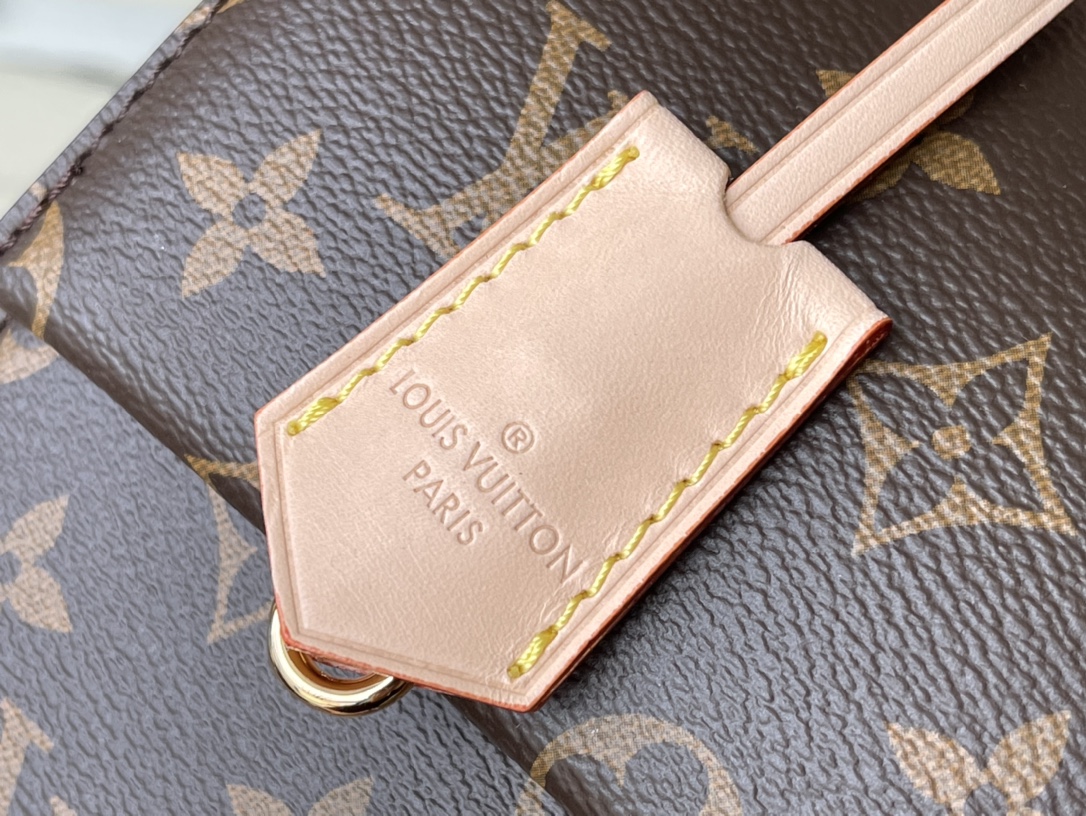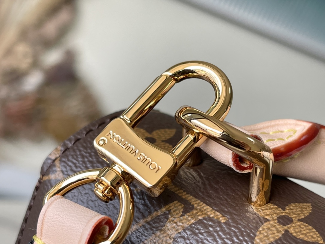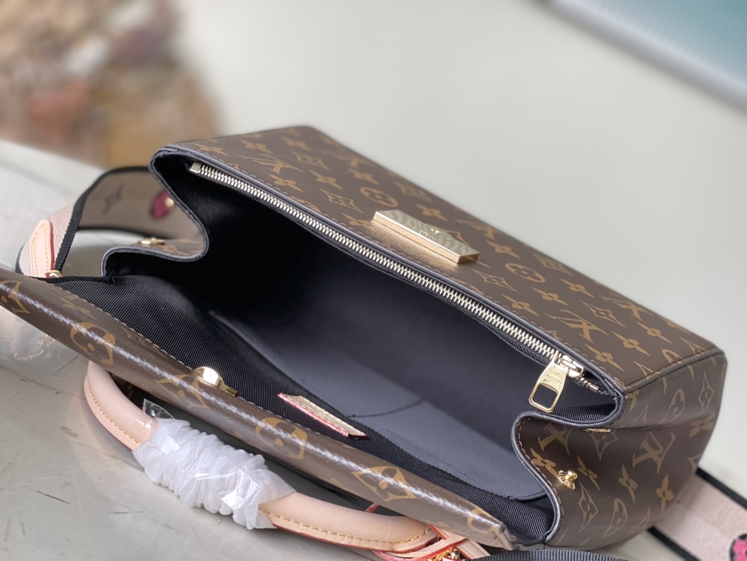 ● Fuchsia/Bordeaux Red ● Monogram coated canvas ● Natural cowhide-leather trim ● Textile lining ● Gold-color hardware ● Magnetic flap closure ● Key bell ● 2 inside flat pockets ● Inside zipped pocket ● 4 protective metal bottom studs ● Strap : Removable, not adjustable ● Strap Drop : 55.0 cm ● Handle : Single