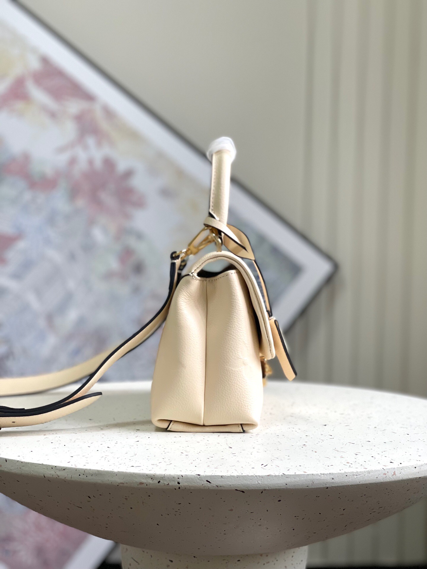 ● Crème Beige ● Embossed grained cowhide leather ● Cowhide-leather trim ● Microfiber lining ● Gold-color hardware ● Central zipped pocket ● Inside flat pocket ● Key bell ● Strap: Removable, adjustable ● Strap Drop: 50.0 cm ● Strap Drop Max.: 55.0 cm ● Handle: Single