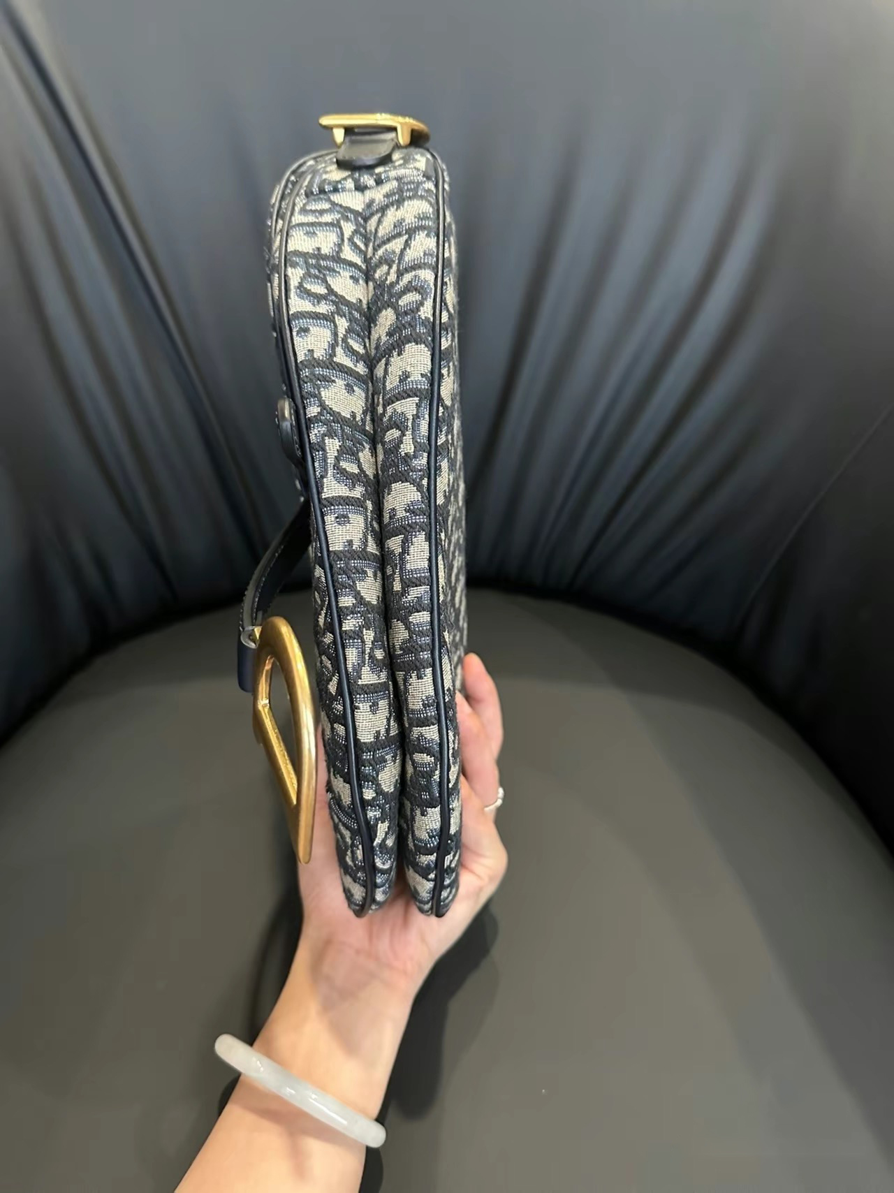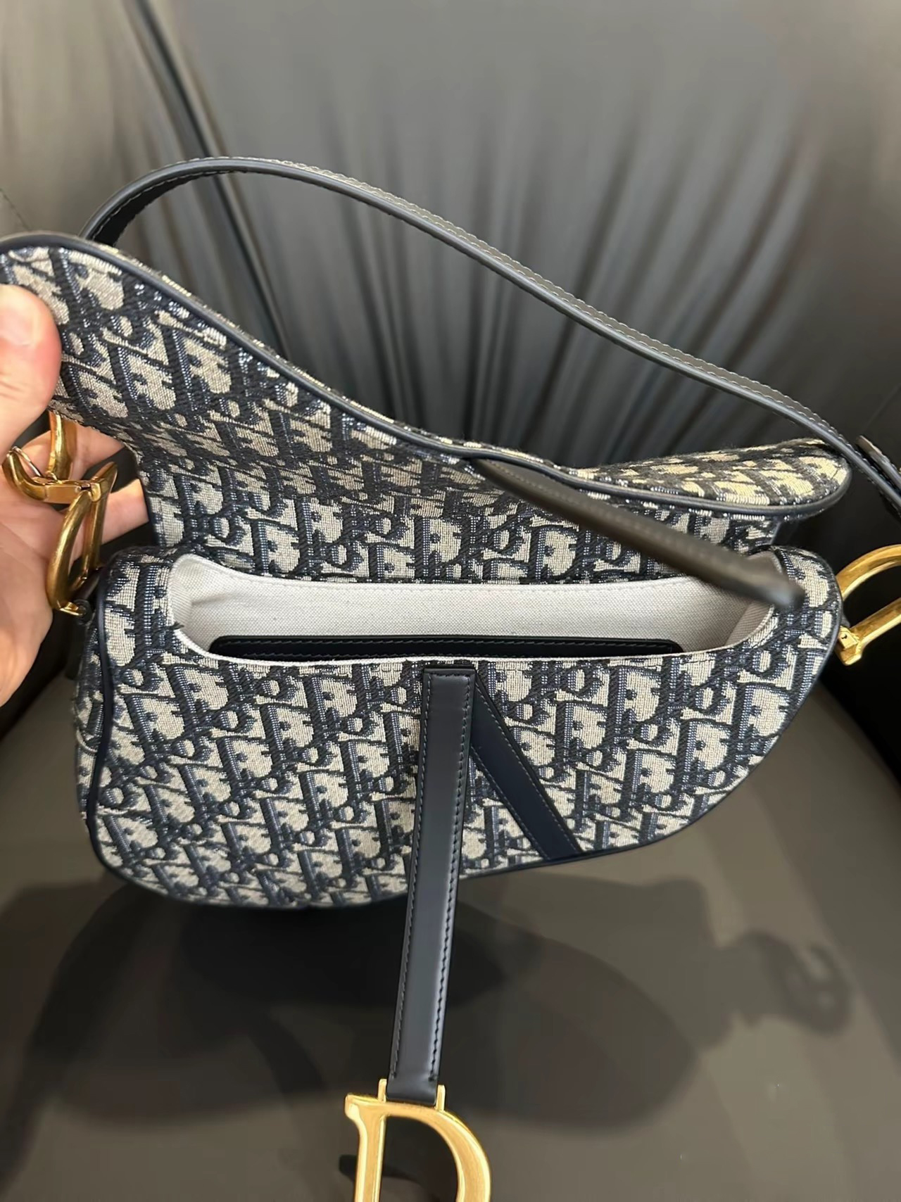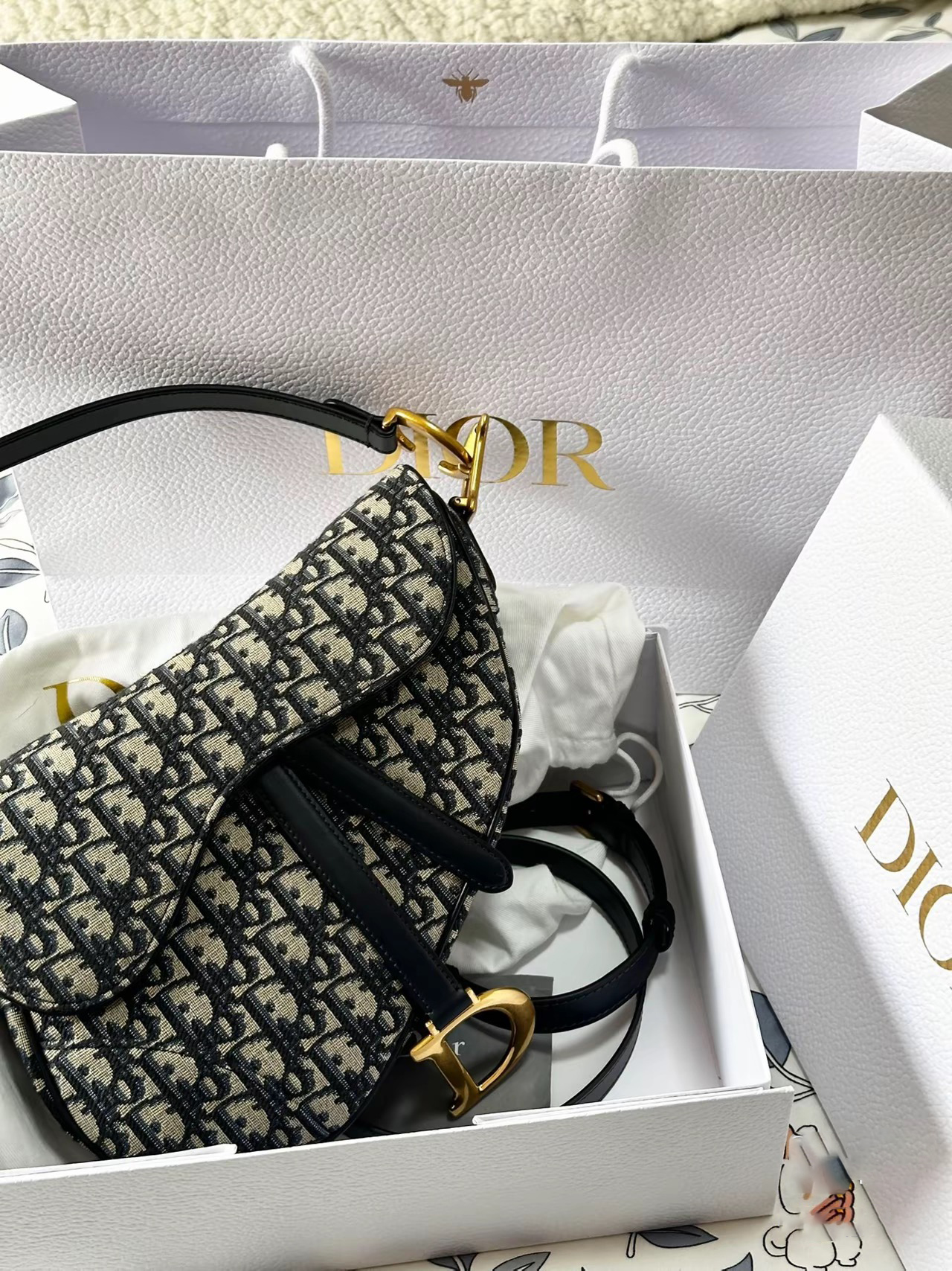 This classic saddle bag is a subtle update by Maria Grazia Chiuri. Crafted in blue Oblique print fabric, the saddle flap features a stirrup D-shaped charm strap and magnetic drawstring, a classic design, and metal CD logos with antique gold finish on both sides of the handles. Mini version with adjustable and removable spaghetti strap for hand, shoulder or crossbody wear.Stirrup D-shaped charm strap and magnetic drawstringCD logo on the handleRemovable and adjustable spaghetti strapRear pocketDust bag includedDue to technical limitations, product improvements or production batches, the information on the website may have color differences, size errors or other details. The product images displayed on the website may not be consistent with the actual appearance of the product. If you have any related questions, please contact customer service