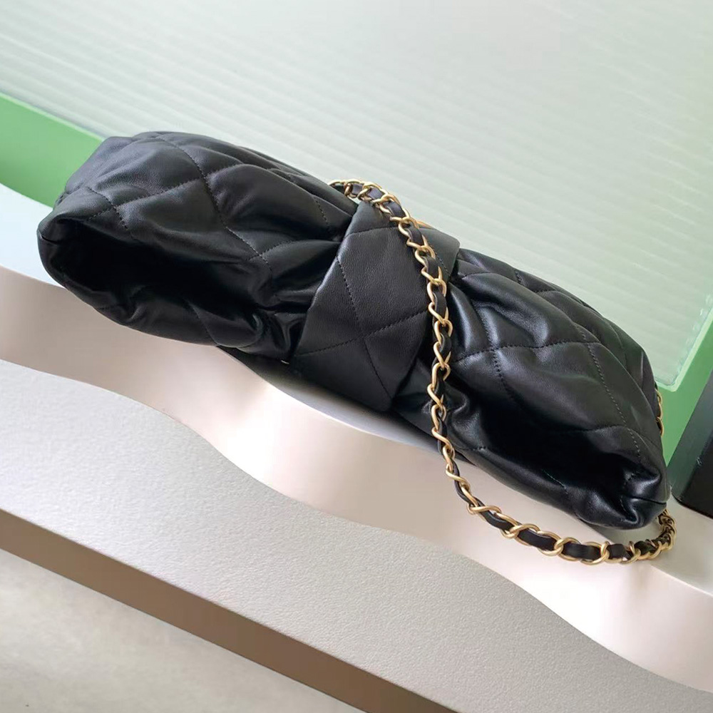 The Fall-Winter 2025/26 Ready-to-Wear collection celebrates the ribbon, an essential element woven into the vocabulary of CHANEL. This black velvet-effect nylon bag features an oversized bow silhouette adorned with a signature metal chain interlaced with leather.