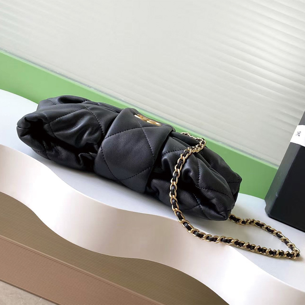 The Fall-Winter 2025/26 Ready-to-Wear collection celebrates the ribbon, an essential element woven into the vocabulary of CHANEL. This mini bag in shiny black lambskin stands out with its oversized bow silhouette adorned with a signature metal chain interlaced with leather.