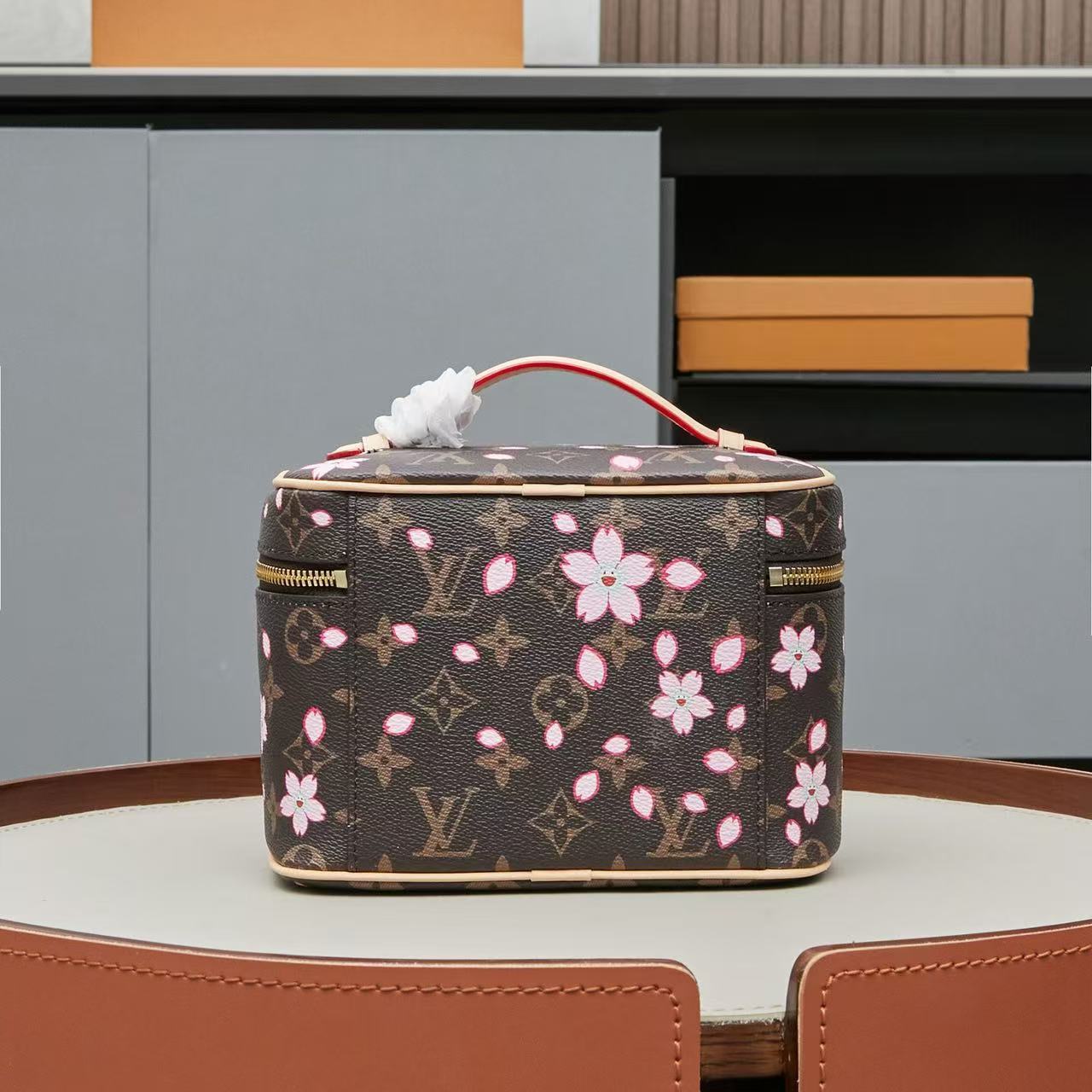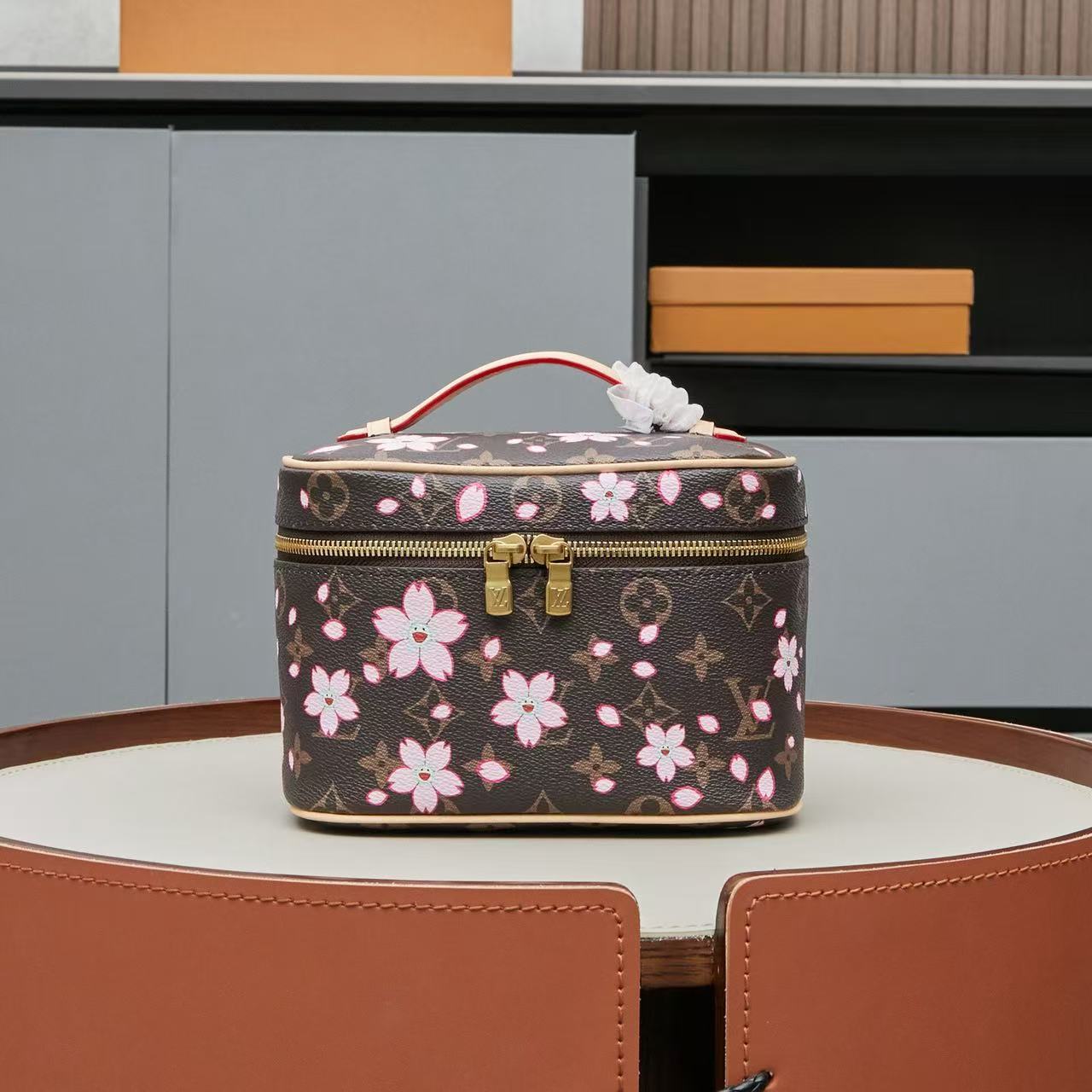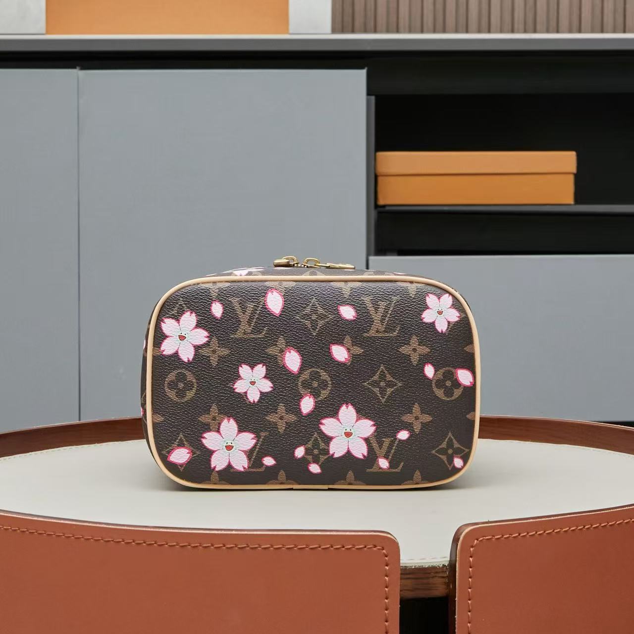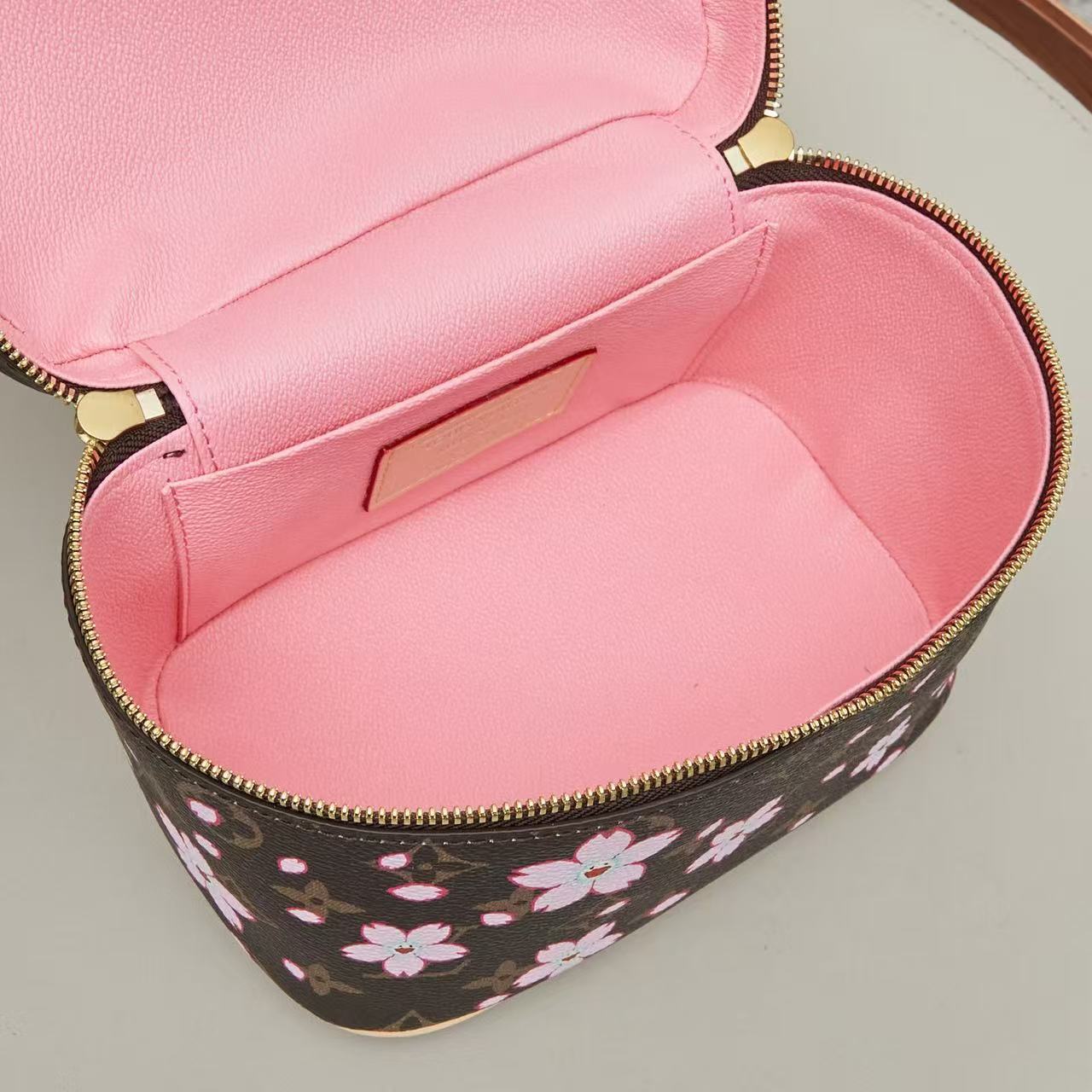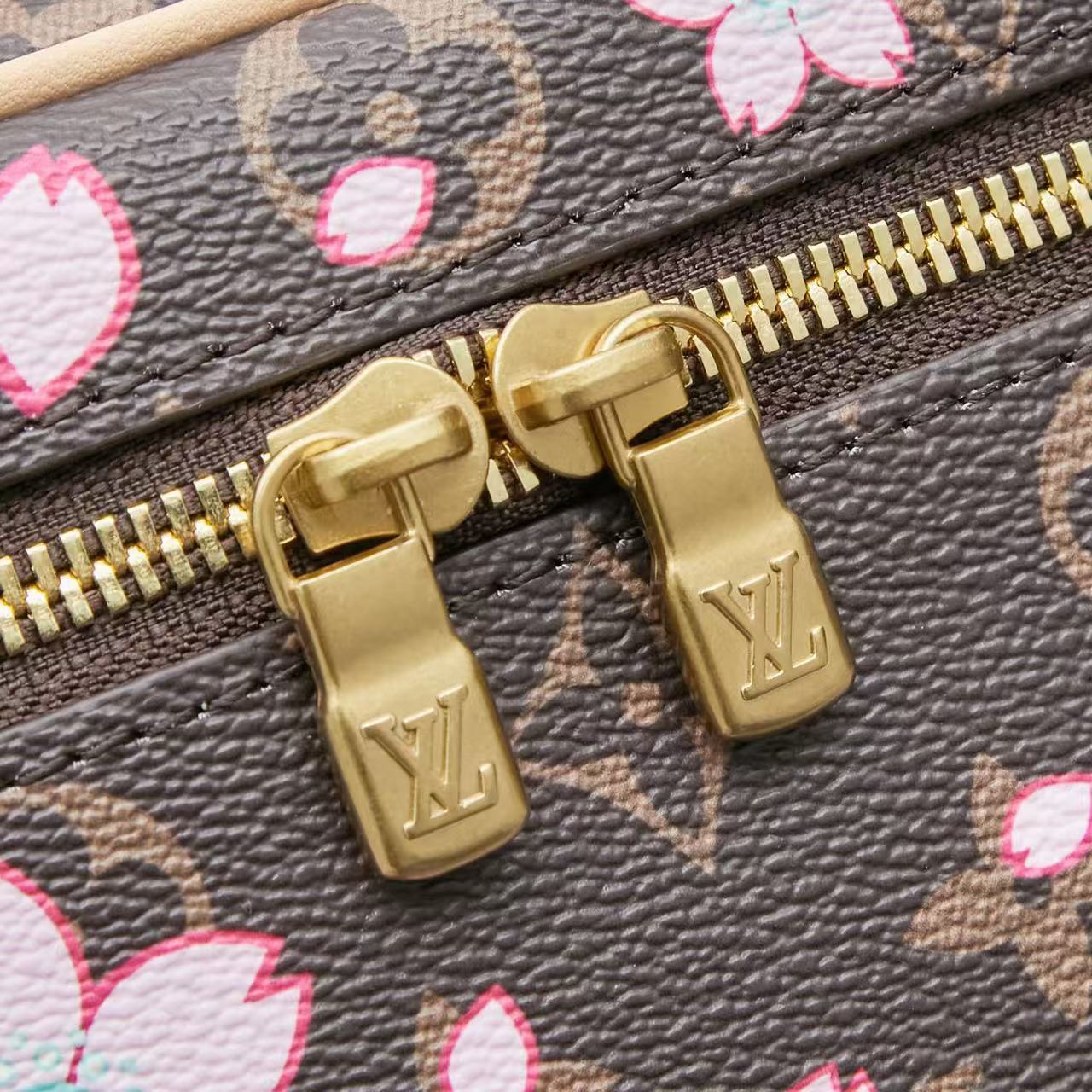 The Nice Mini toiletry bag is crafted in a rounded boxy shape in bijou proportions from the House’s classic Monogram coated canvas, which is playfully overlaid with celebratory Cherry Blossom motifs from the re-edition of the Louis Vuitton x Takashi Murakami collection.