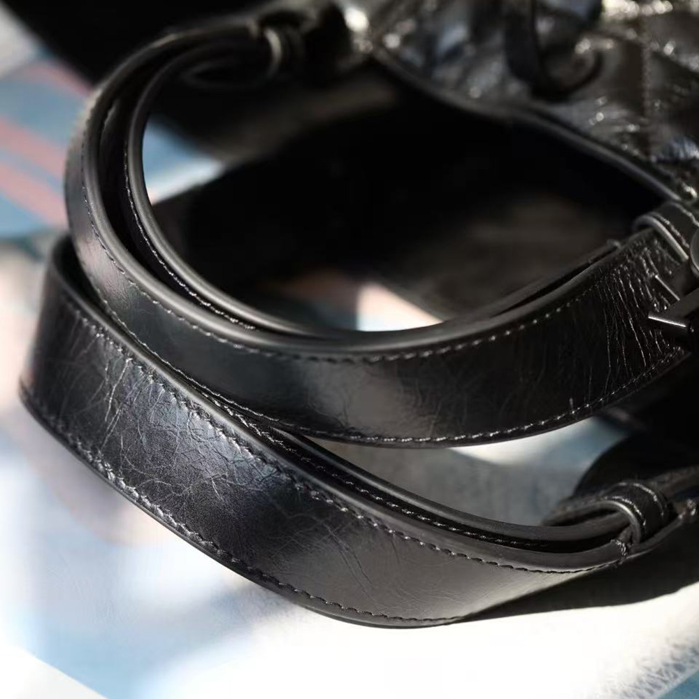 The Dior Toujours bag is distinguished by a casual and practical design. Demonstrating the House's savoir-faire, the style is constructed in black crinkled calfskin, enhanced by the quilted effect of the Macrocannage motif. It showcases a spacious interior compartment with a matching pouch to organize the essentials. Its thin leather strap closure keeps items secure while the D of the CD Lock closure twists to alter the sides and enhance the bag's silhouette. The leather top handles can be adjusted using the small notches to allow the medium bag to be carried by hand or worn over the shoulder.
